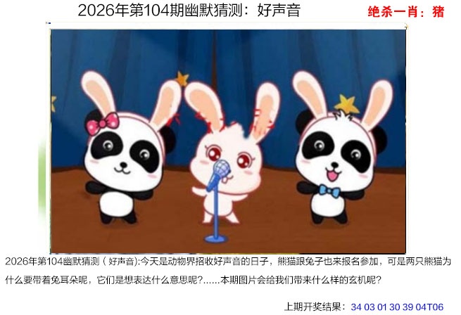 :?00】中 今天是动物界招收好声音的日子,熊猫跟兔子也来报名参加,可是两只熊猫为什么要带着兔耳朵呢,它们是想表达什么意思呢?..本期图片会给我们带来什么样的玄机呢?